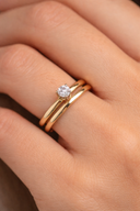 Her vælger mange at kombinere forlovelsesringen med en enkel vielsesring uden sten, så diamanten får lov at stå i fokus.