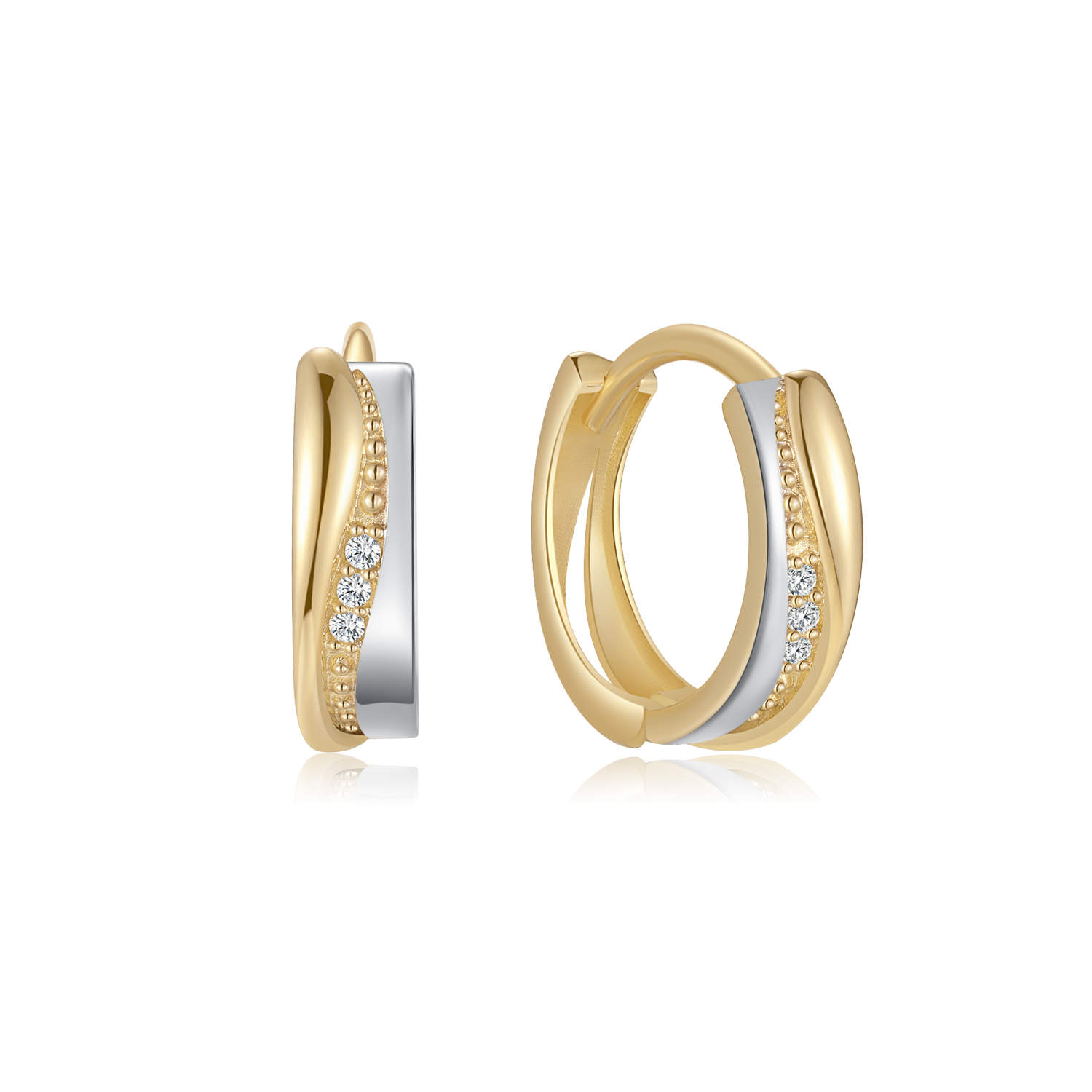 8 kt. guld creol med syntetisk cubic zirconia som snor sig mellem rødguld og rhodium på hver sin side. Mål: 10 mm. i diameter.