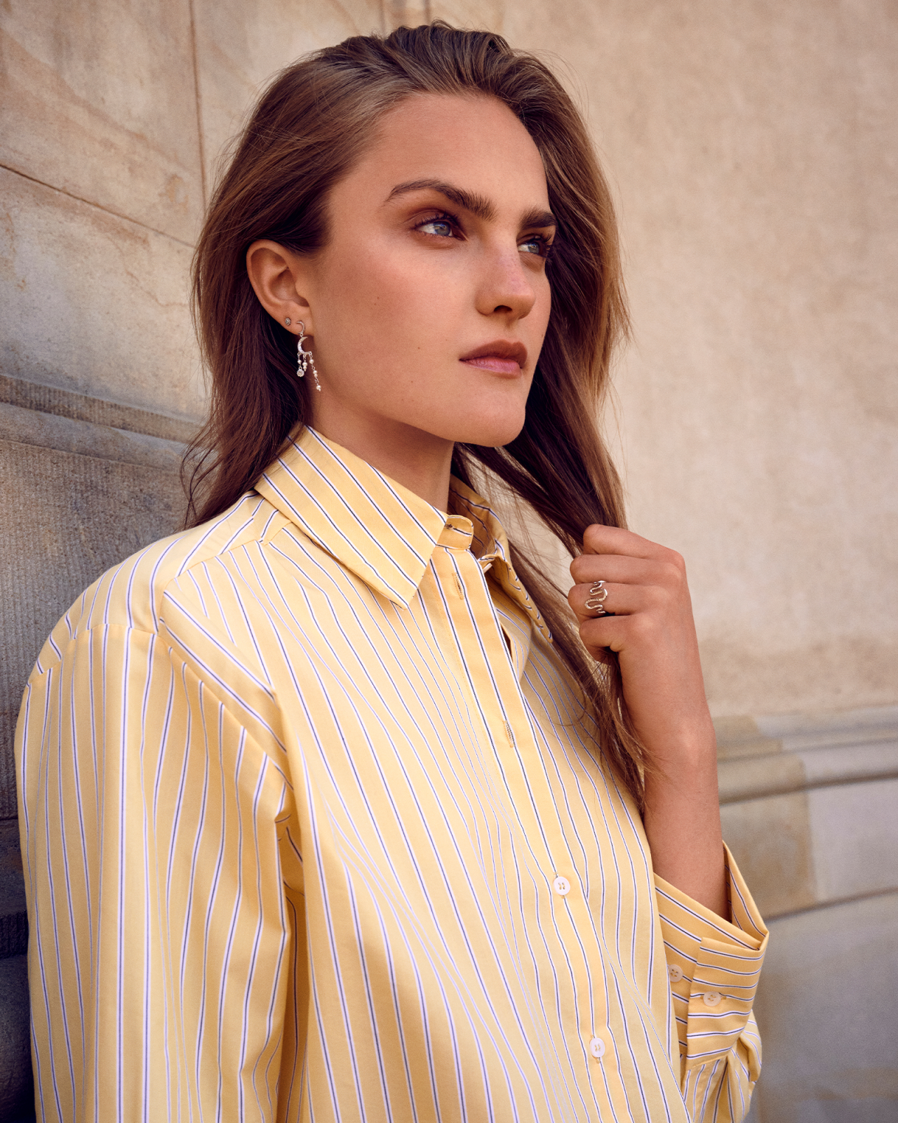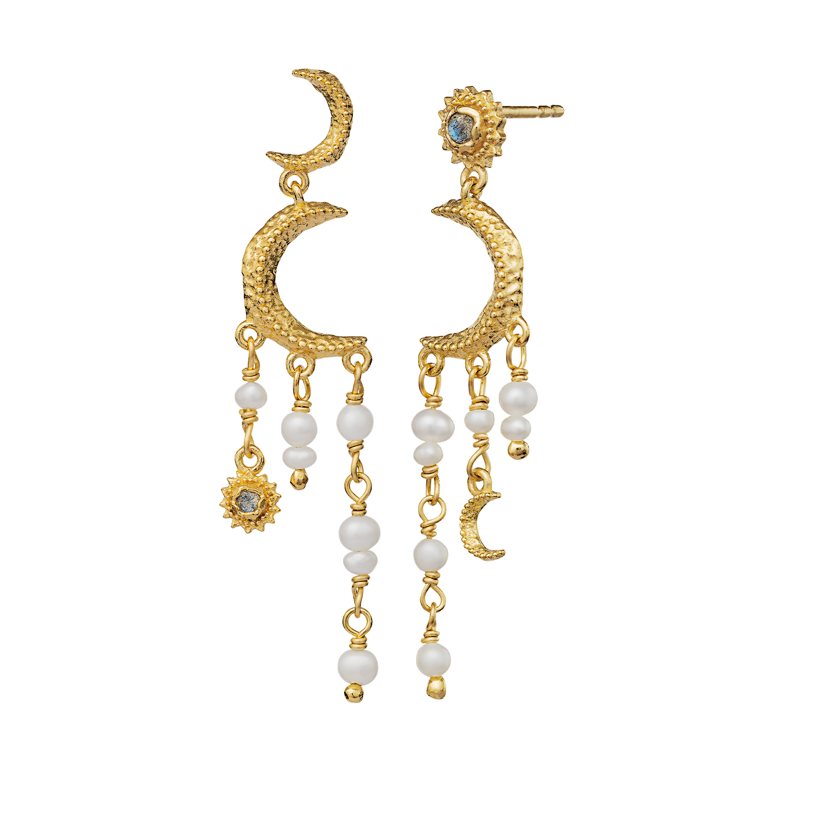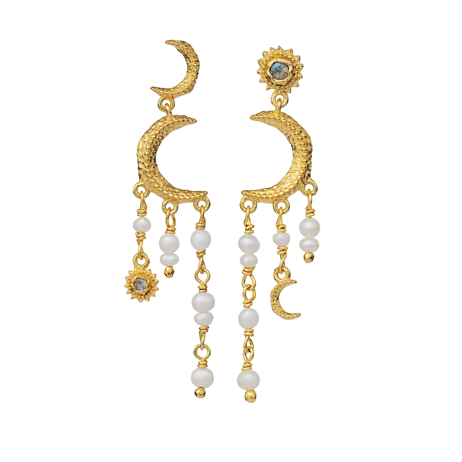 Labradorit og ferskvandsperler er det vidunderlige match i Astrea-øreringene og står med deres symbol for solen og månen for verdens dualisme, lys og mørke, nat og dag.