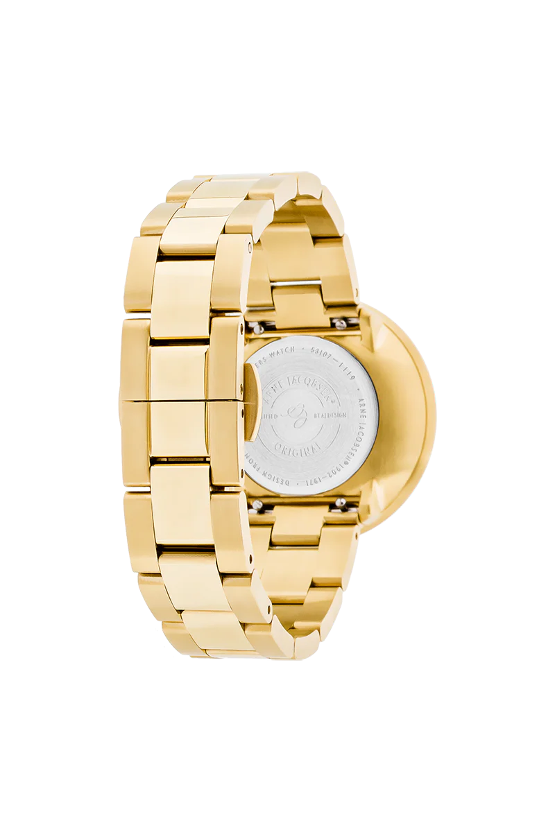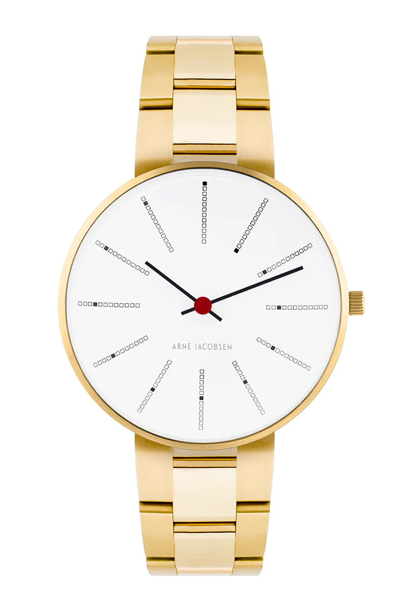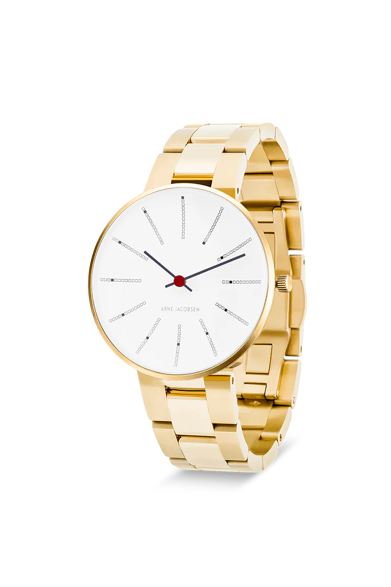 Arne Jacobsen bankers armbåndsur med poleret og børstet guld 16 mm lænke... Massiv urkasse i rustfrit stål med konkav urskive, hærdet dobbelt konveks M2-glas, 3 ATM.