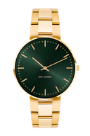 Arne Jacobsen City Hall 34 mm armbåndsur med Evergreen urskive og IP-guld lænke. Massiv urkasse i rustfrit stål med konkav urskive, hærdet dobbelt konveks M2-glas, 3 ATM.