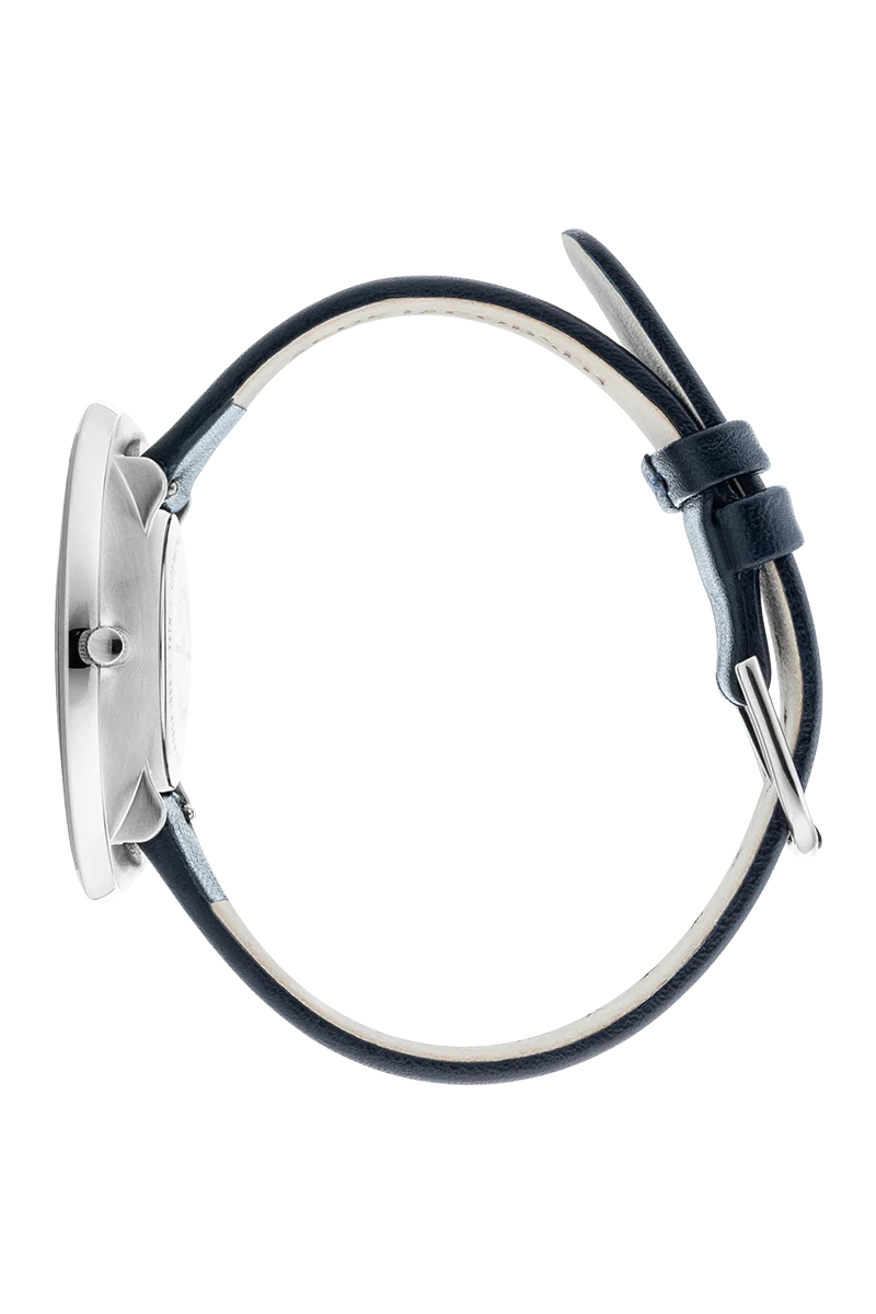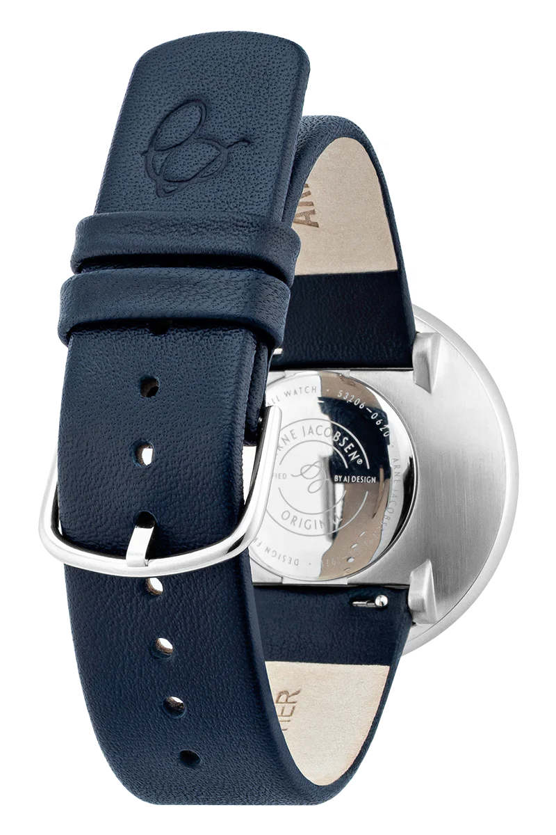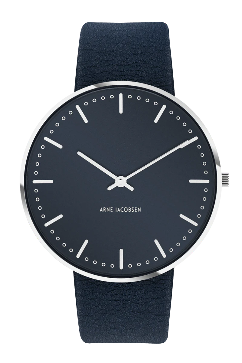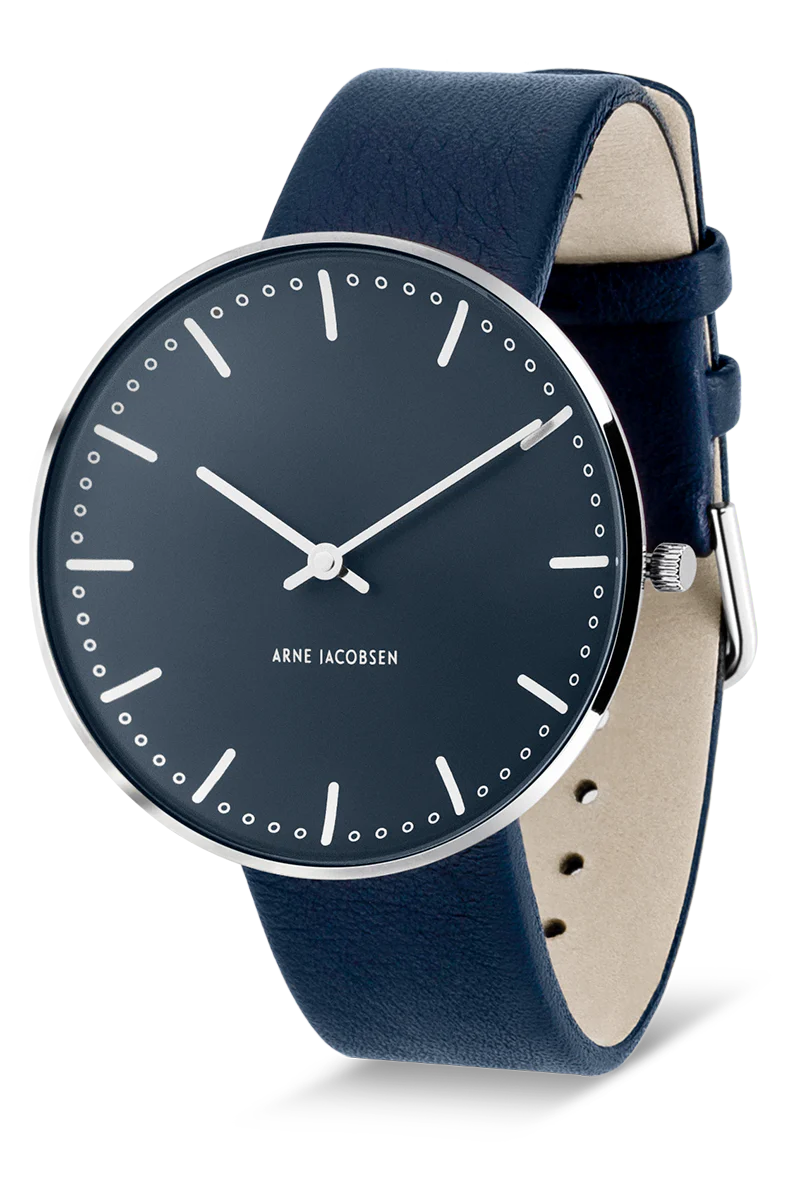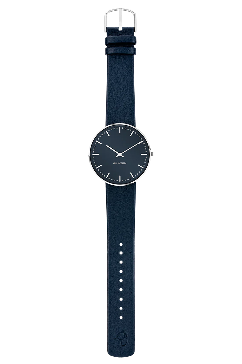 Arne Jacobsen City Hall armbåndsur med oxfordblå 20 mm læderrem i kalveskind med poleret stålspænde.. Massiv urkasse i rustfrit stål med konkav urskive, hærdet dobbelt konveks M2-glas, 3 ATM.