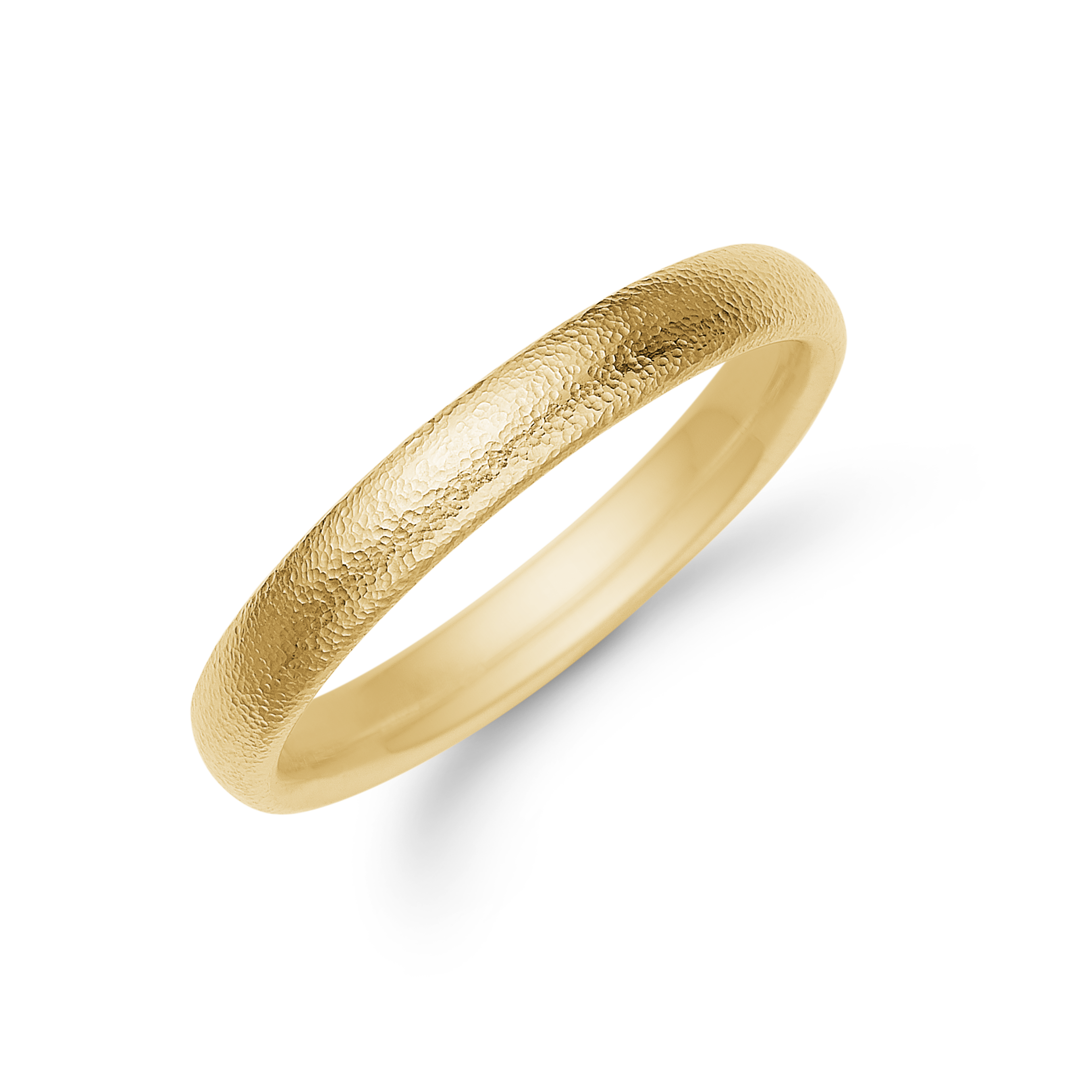 Hamret vielsesring i 14 karat karat guld til ham uden sten. Ringen har en mat og hamret overflade.