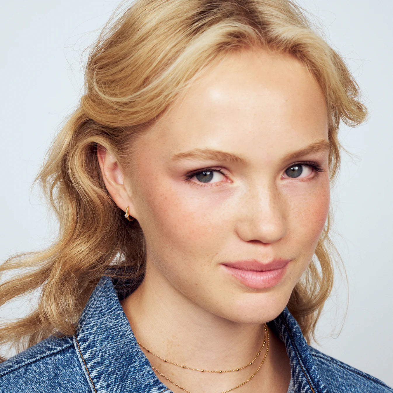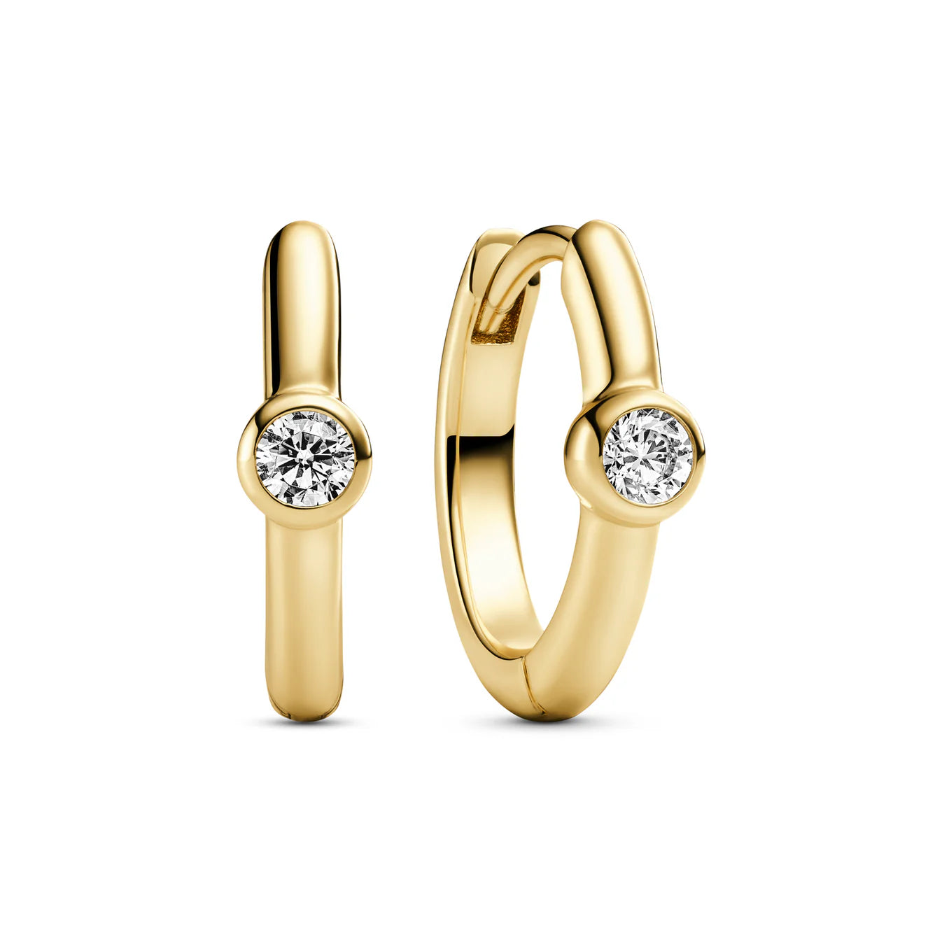 Øreringe af 18 karat forgyldt 925 sterlingsølv, med en poleret overflade og en håndsatte facetslebet hvid zirkon. Øreringe mål: Indvendig diameter 10 mm