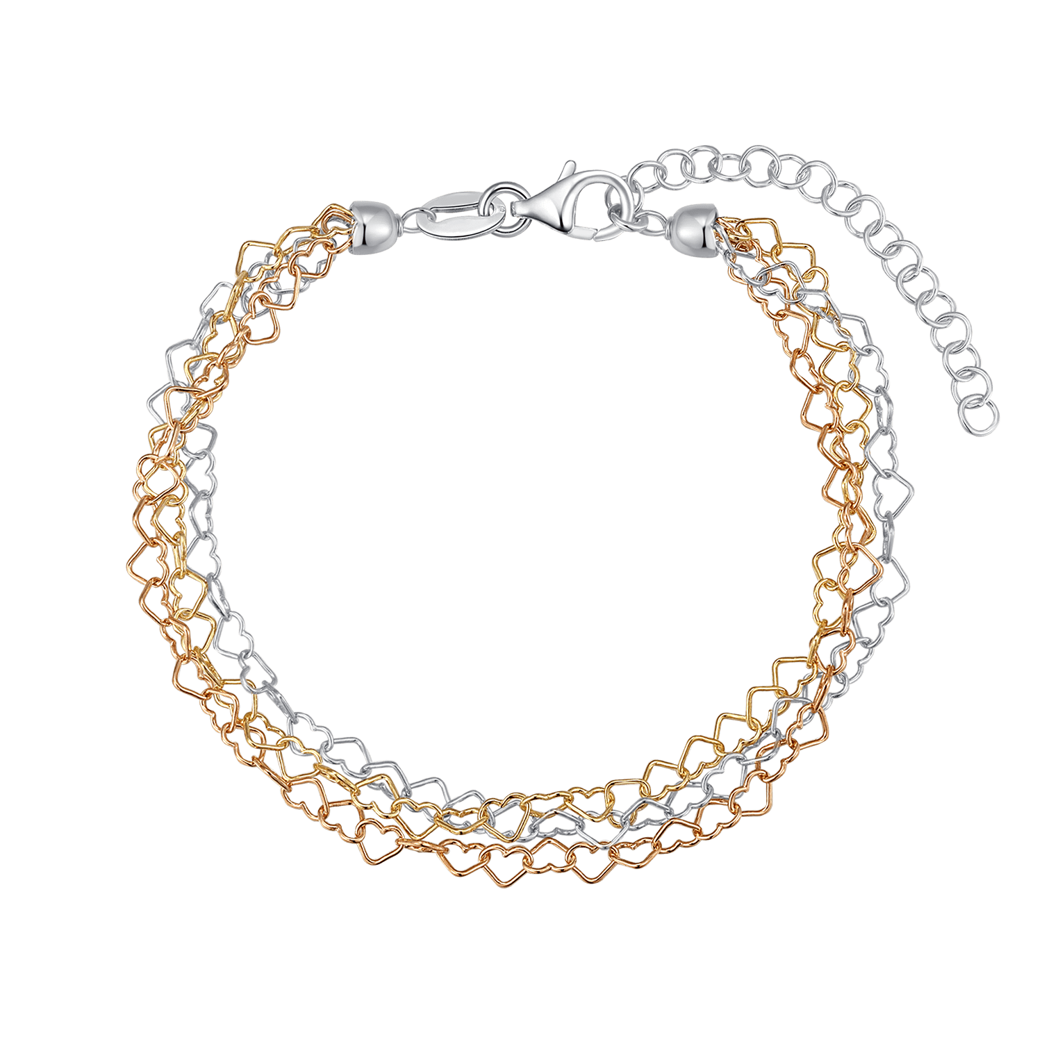 Sølv armbånd hjerter i 3 rækker i rhodineret, forgyldt og rosa forgyldt sølv. Længde 17+4 cm.