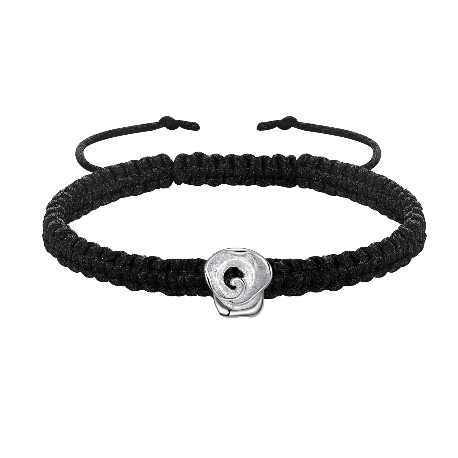 Sølv armbånd knyttet sort silke med sølvblomst med krølle