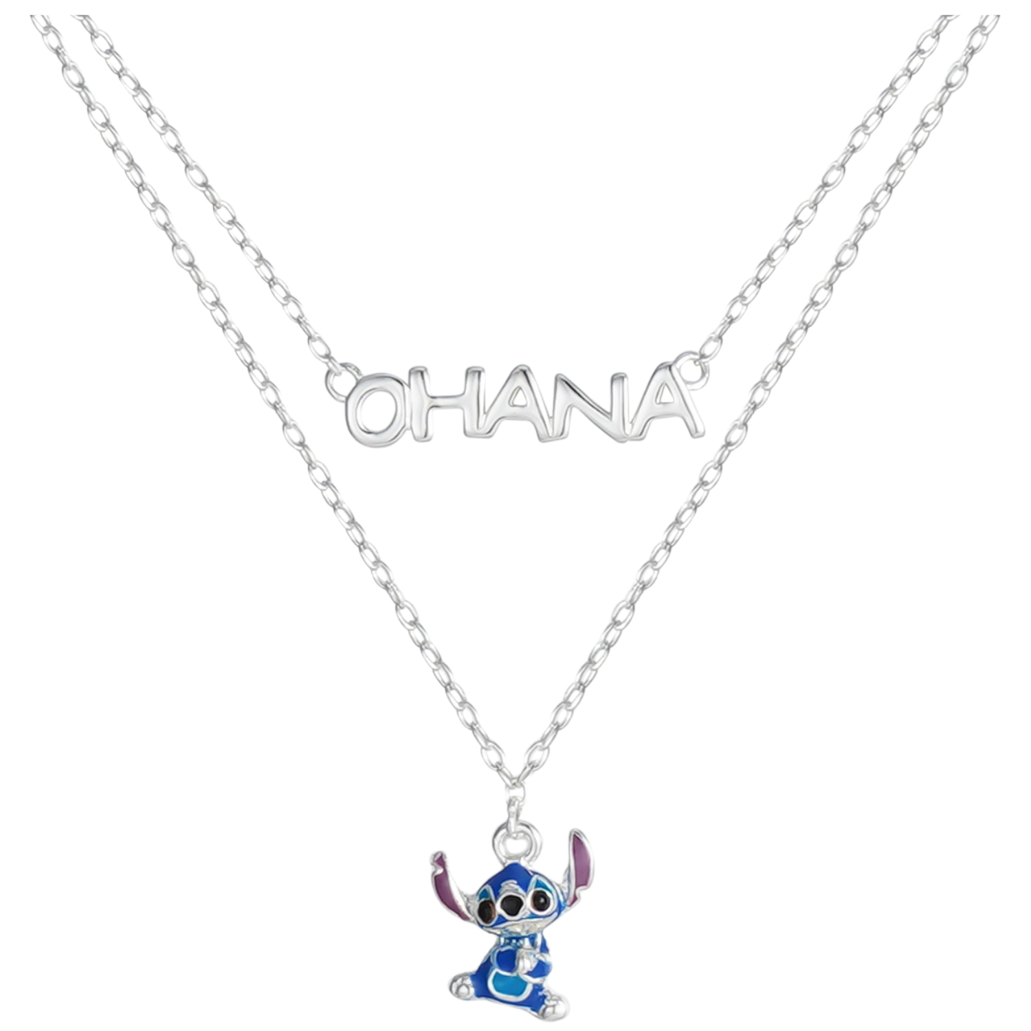 Sølv halskæde Stitch med teksten OHANA.på dobbelt kæde. Mål: 7 x 4 mm. Kæden i længde 35-38-40 cm.