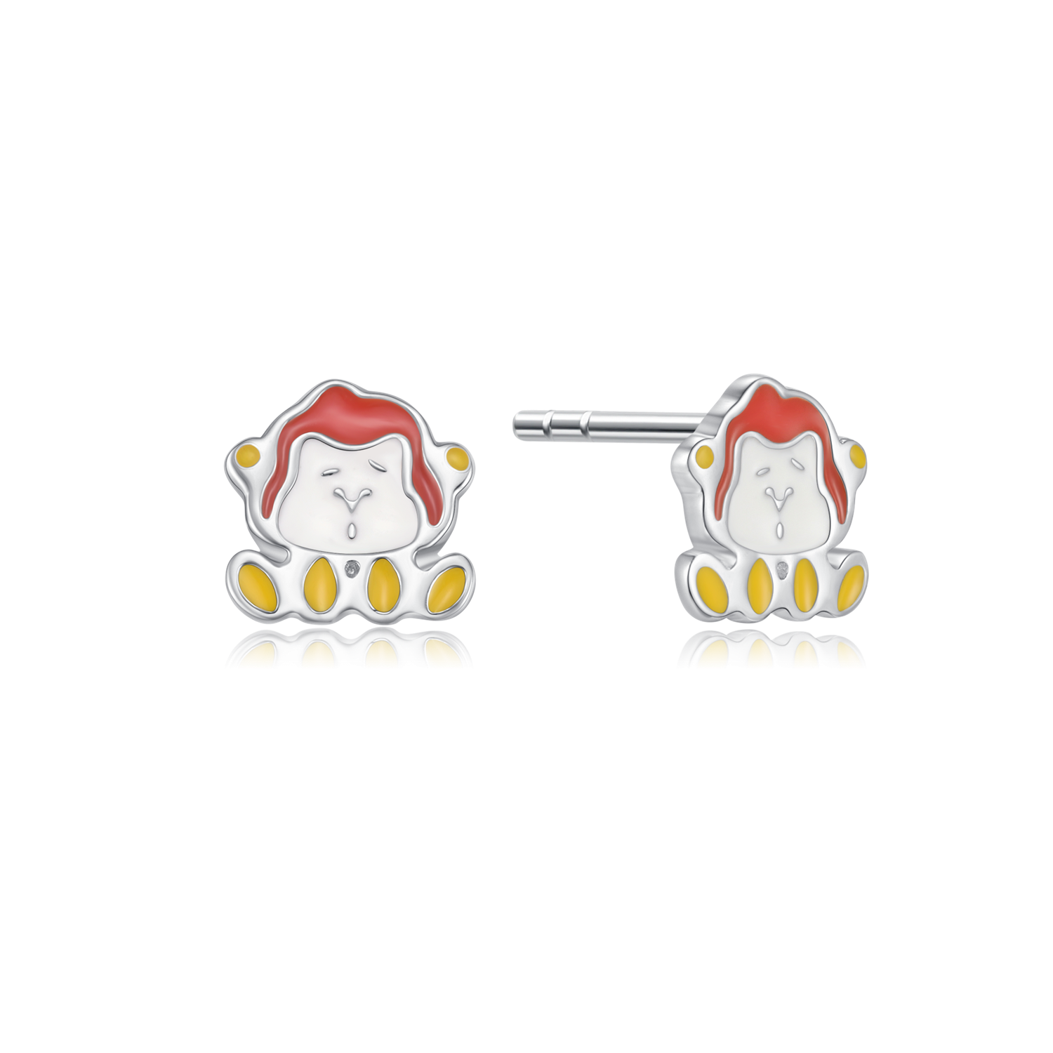 Sølv ørestikker rhodineret abe i hvid, rød og gul blyfri emalje.