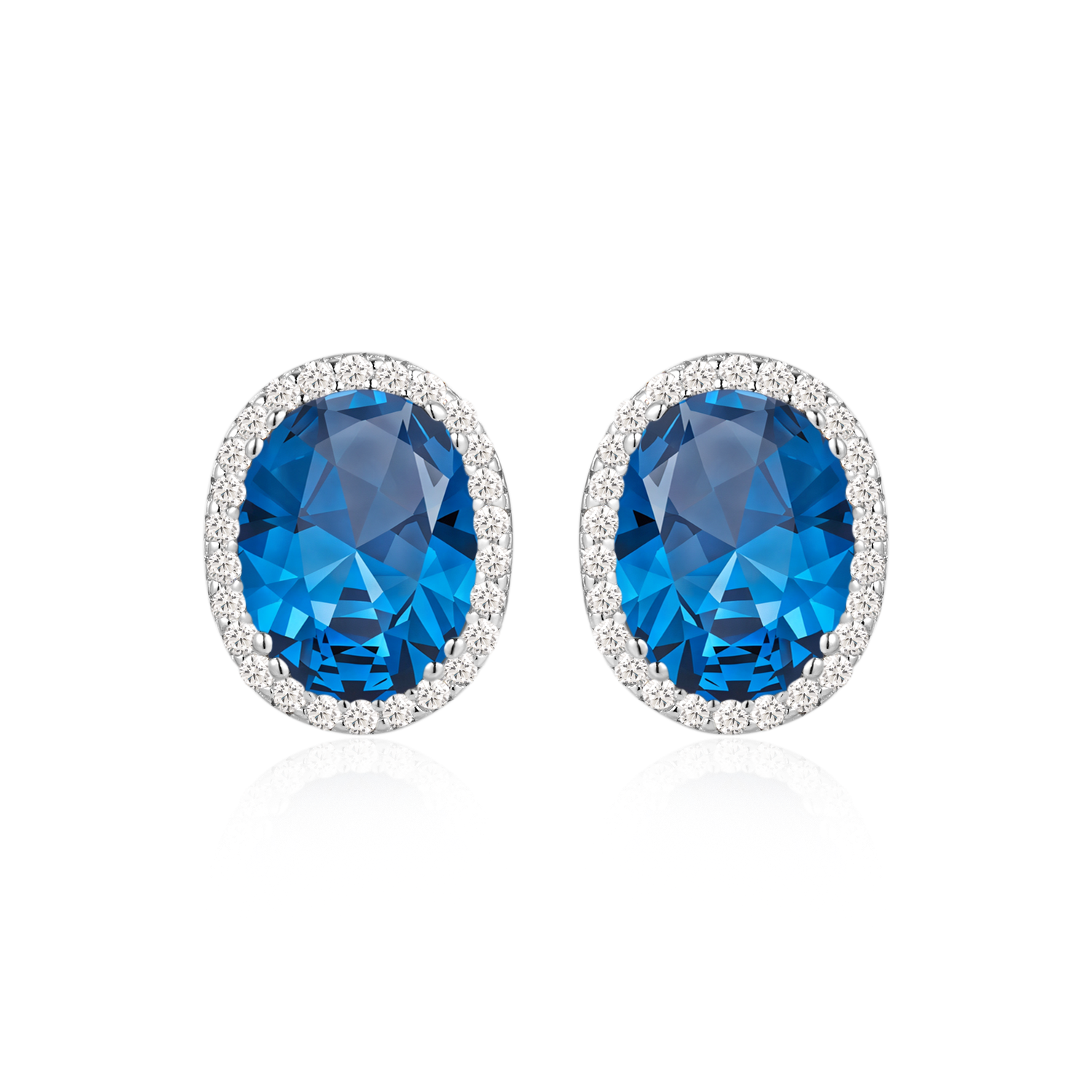 Sølv ørestikker rhodineret oval med syntetiske london blå topasmed syntetiske cubic zirconia rundt om