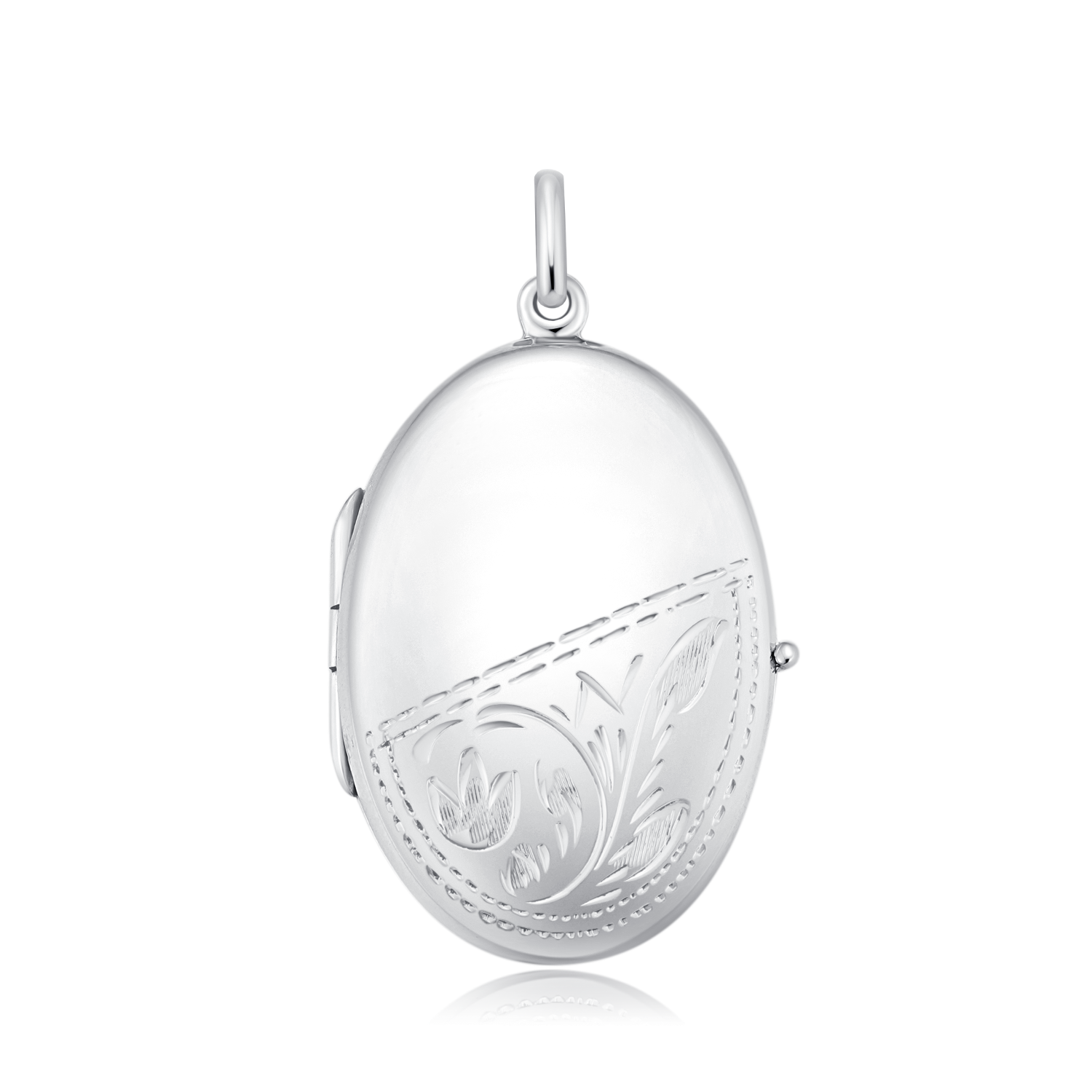 Sølv vedhæng oval medaljon med mønster nederst på skrå. Mål: 25 x 34 mm.
