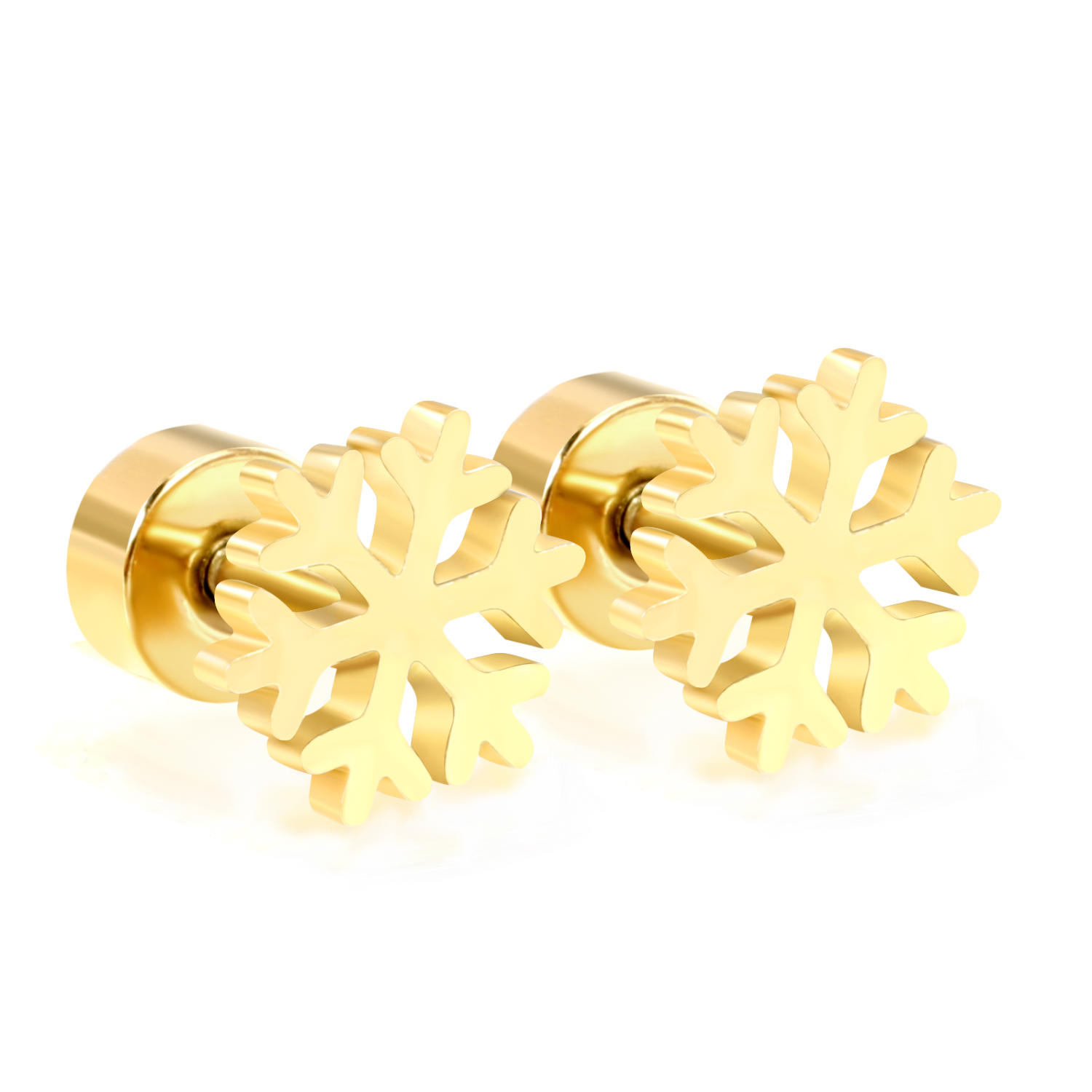 Stål forgyldt ørestikker snefnug med dreje lås. (I stål, så ingen højre venstre) Mål: 6,7 x 5,8 mm.