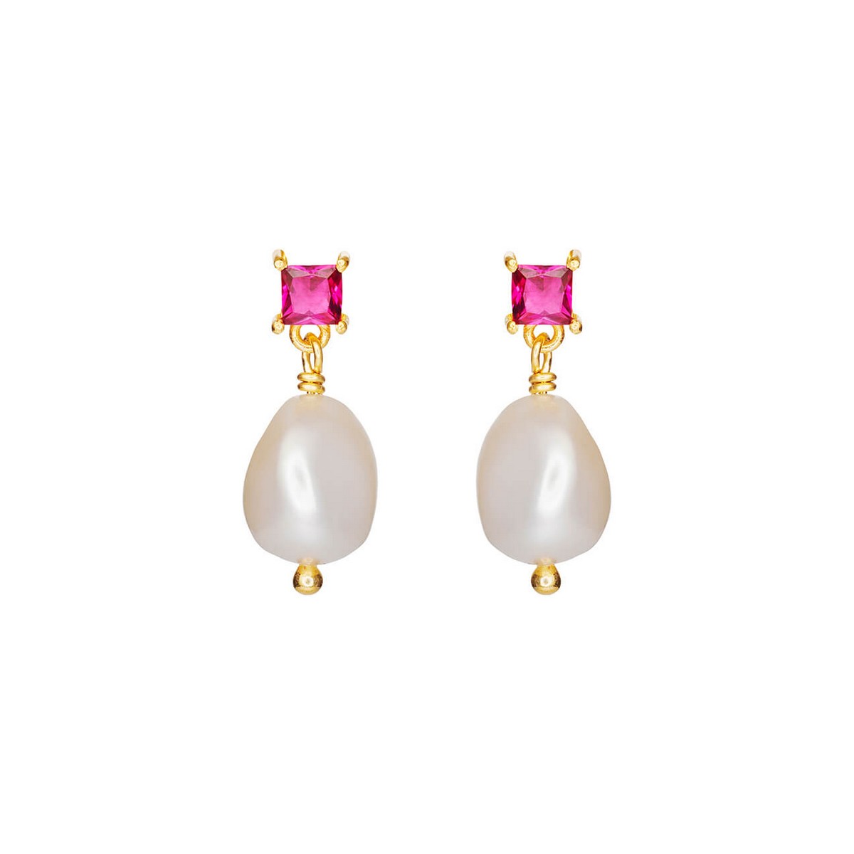 Ørering (stik), forgyldt sølv, pink firkantet zirkon med hvid ferskvandsperle under