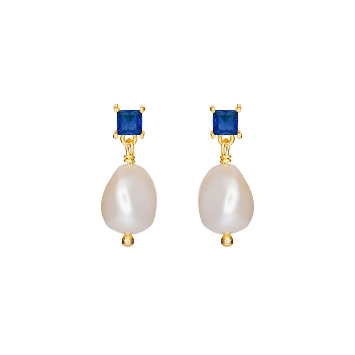 Ørering (stik), forgyldt sølv, safirblå firkantet zirkon med hvid ferskvandsperle under